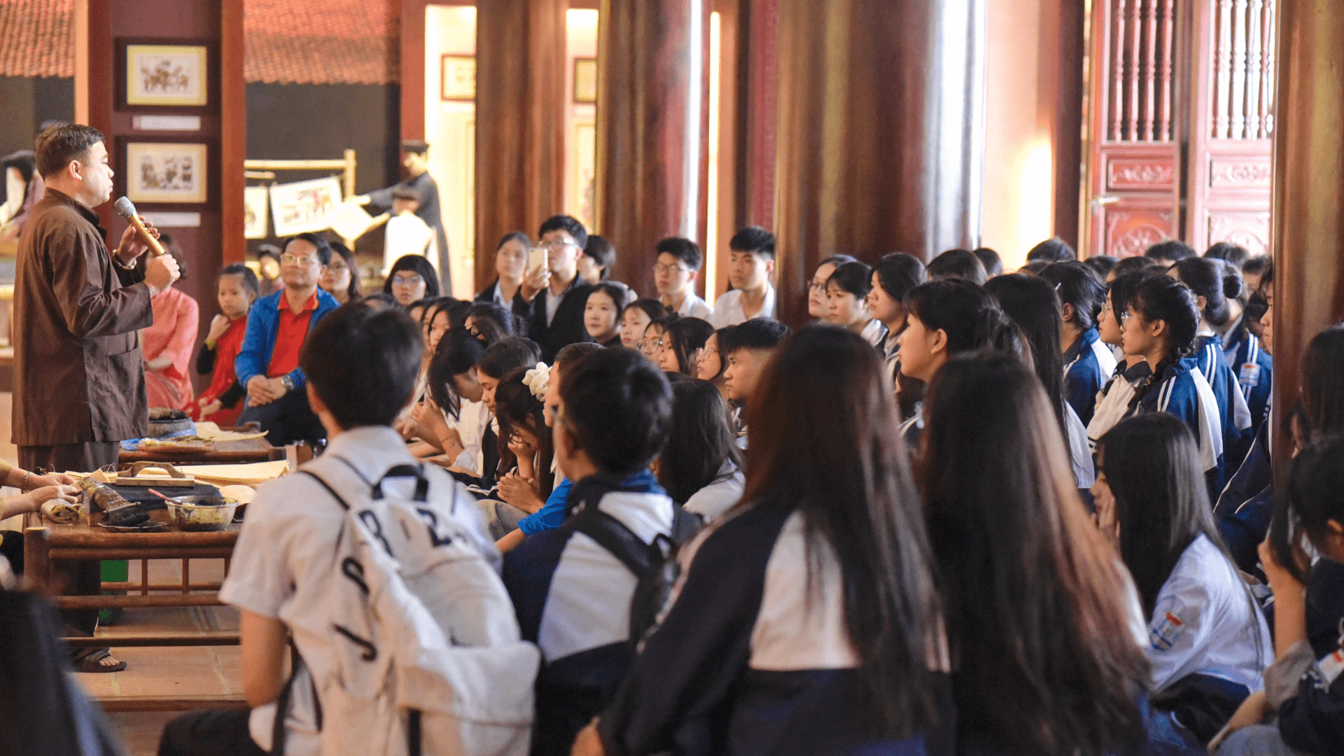Các em học sinh lắng nghe giới thiệu về lịch sử hình thành và phát triển của tranh Đông Hồ.